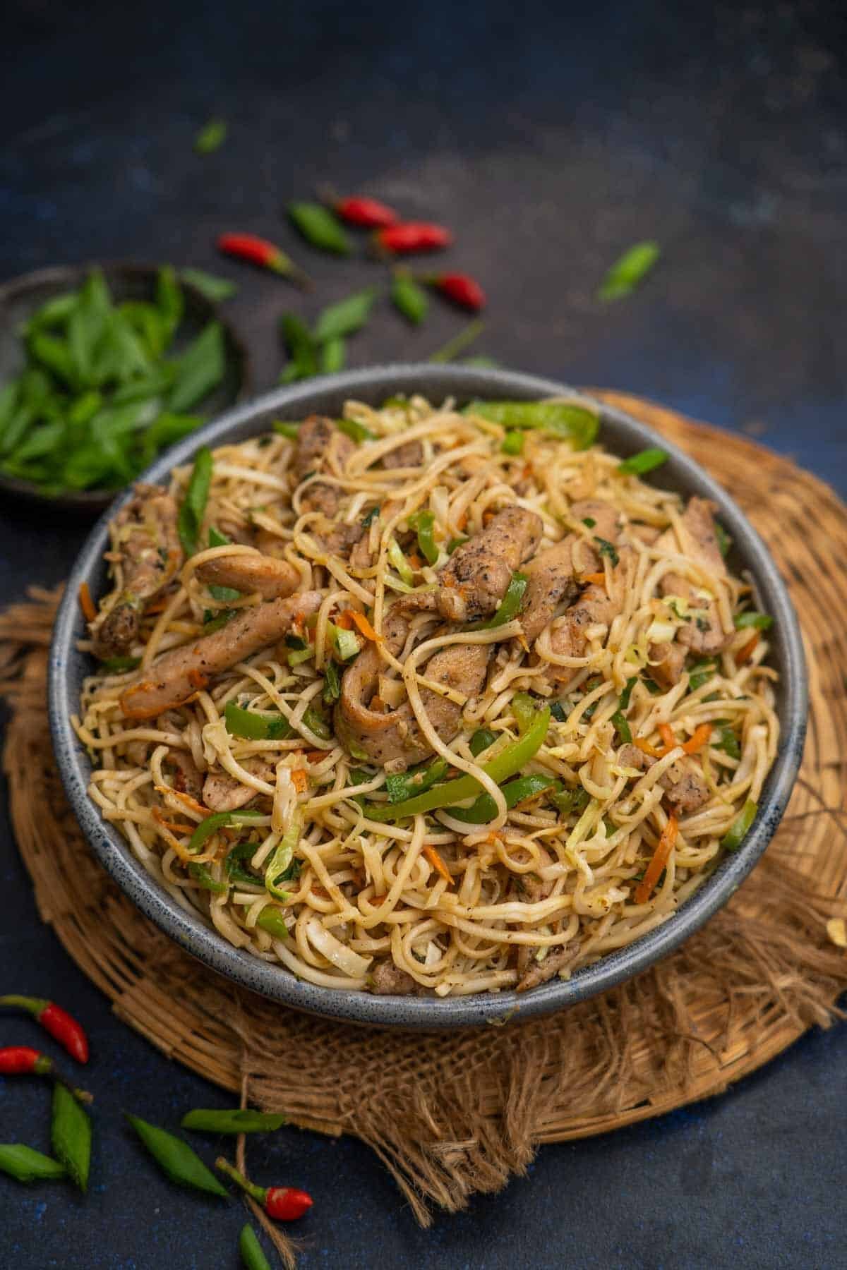 Wok‑stirred egg noodles with tender chicken and crunchy vegetables in a savoury, spicy Indo‑Chinese sauce — a filling, flavour-packed dish.