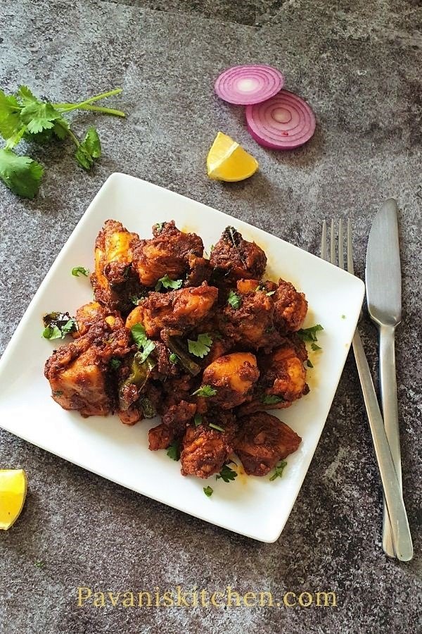 Juicy chicken pieces stir-fried and coated in a fiery roasted spice paste with ghee—bold, aromatic, and richly-flavored.