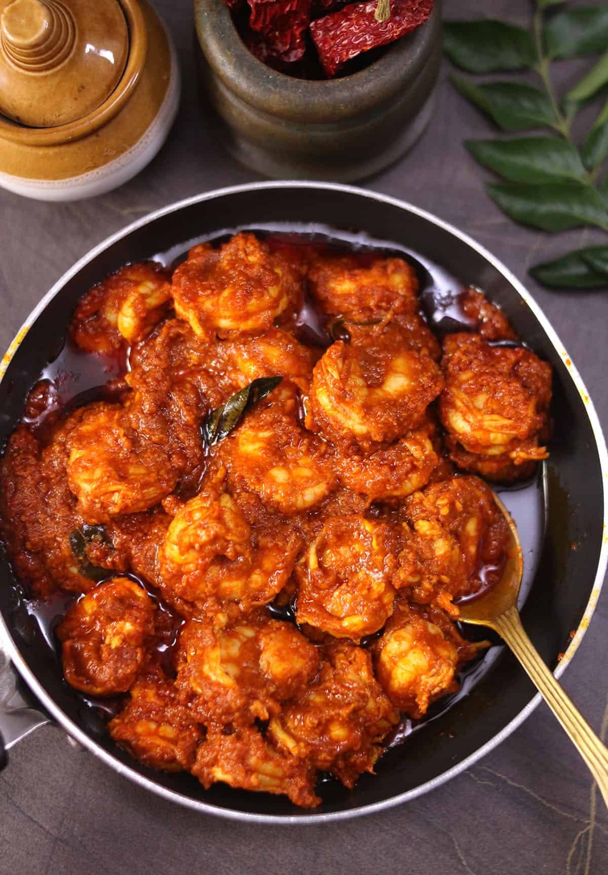 Fiery, flavorful prawns roasted in aromatic ghee and masala paste — perfect as a spicy seafood starter.